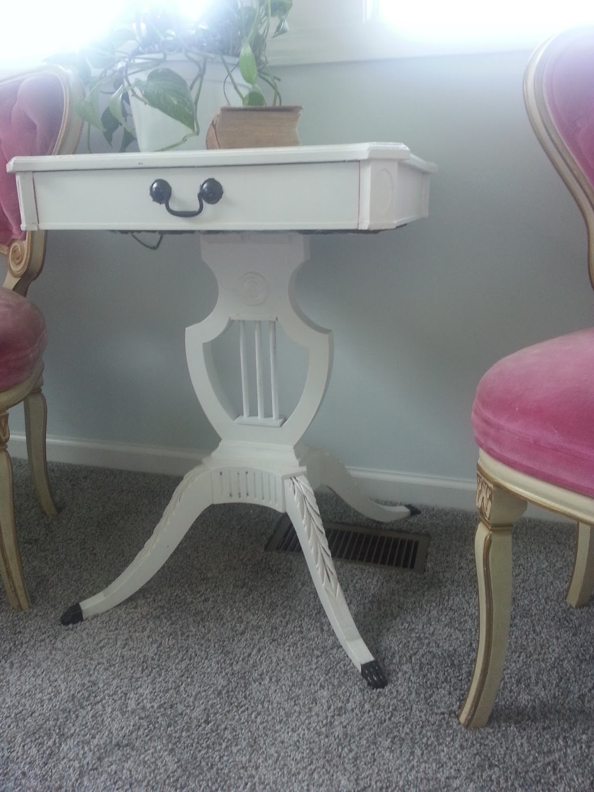 While driving around, I found a beautiful circular pedestal table with three chairs, for free! I love it when this happens because I always feel that if I haven't invested any money into it initially, I can be a little more experimental and I don't feel obligated to keep things the way they are. For instance, if I receive something from my grandparents, it is harder for me to refinish it than if I find it on the side of the road. Or if I purchase something, I want to put less money into it and use what I have on hand to make it new.